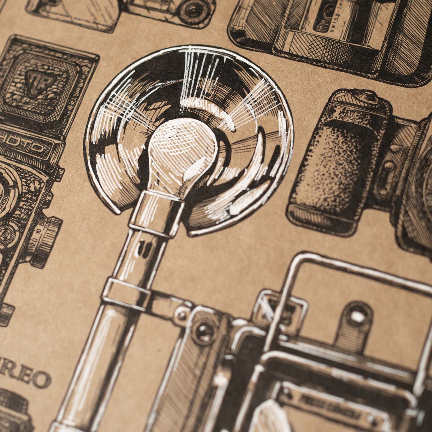 Grafika z serii „Niebo nad Śląskiem” przedstawia różnorodne aparaty fotograficzne – od historycznych modeli, przez klasyczne lustrzanki, aż po współczesne konstrukcje. Ukazane zostały zarówno kamerki otworkowe, aparaty wielkoformatowe, kultowe Polaroidy, jak i aparaty na kliszę czy nowoczesne cyfrowe rozwiązania. Kompozycja pełna detali odzwierciedla rozwój fotografii i jej bogatą historię na przestrzeni lat.