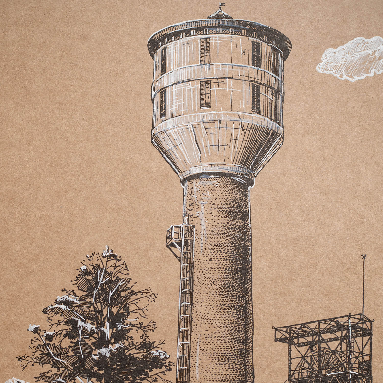 Grafika z serii „Niebo nad Śląskiem” przedstawia zabytkową Kopalnię Ignacy w Rybniku, która od lat jest symbolem industrialnego dziedzictwa i górniczej historii Śląska. Charakterystyczna sylwetka kopalni, z jej unikalnymi detalami architektonicznymi, została ukazana na tle ręcznie rysowanego nieba z białymi chmurami, które wprowadzają do pracy wyjątkową lekkość i artystyczną głębię.