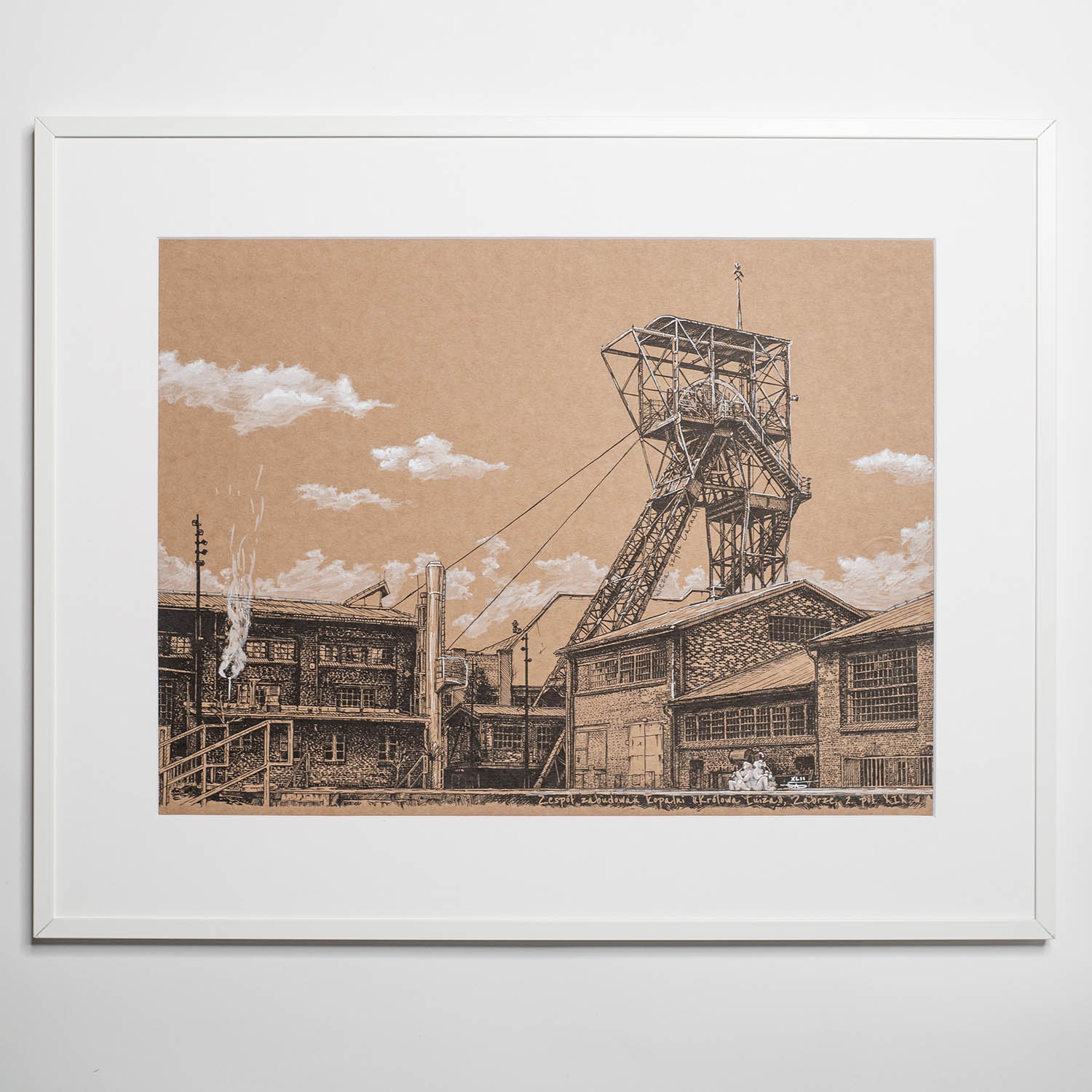 Grafika z serii „Niebo nad Śląskiem” przedstawia historyczną Sztolnię Królowa Luiza w Zabrzu – jeden z najważniejszych zabytków górniczych na Śląsku. Architektoniczne detale sztolni zostały ukazane na tle ręcznie rysowanego, unikalnego nieba z białymi chmurami, które dodają pracy poetyckiego charakteru i wyjątkowego wyrazu.