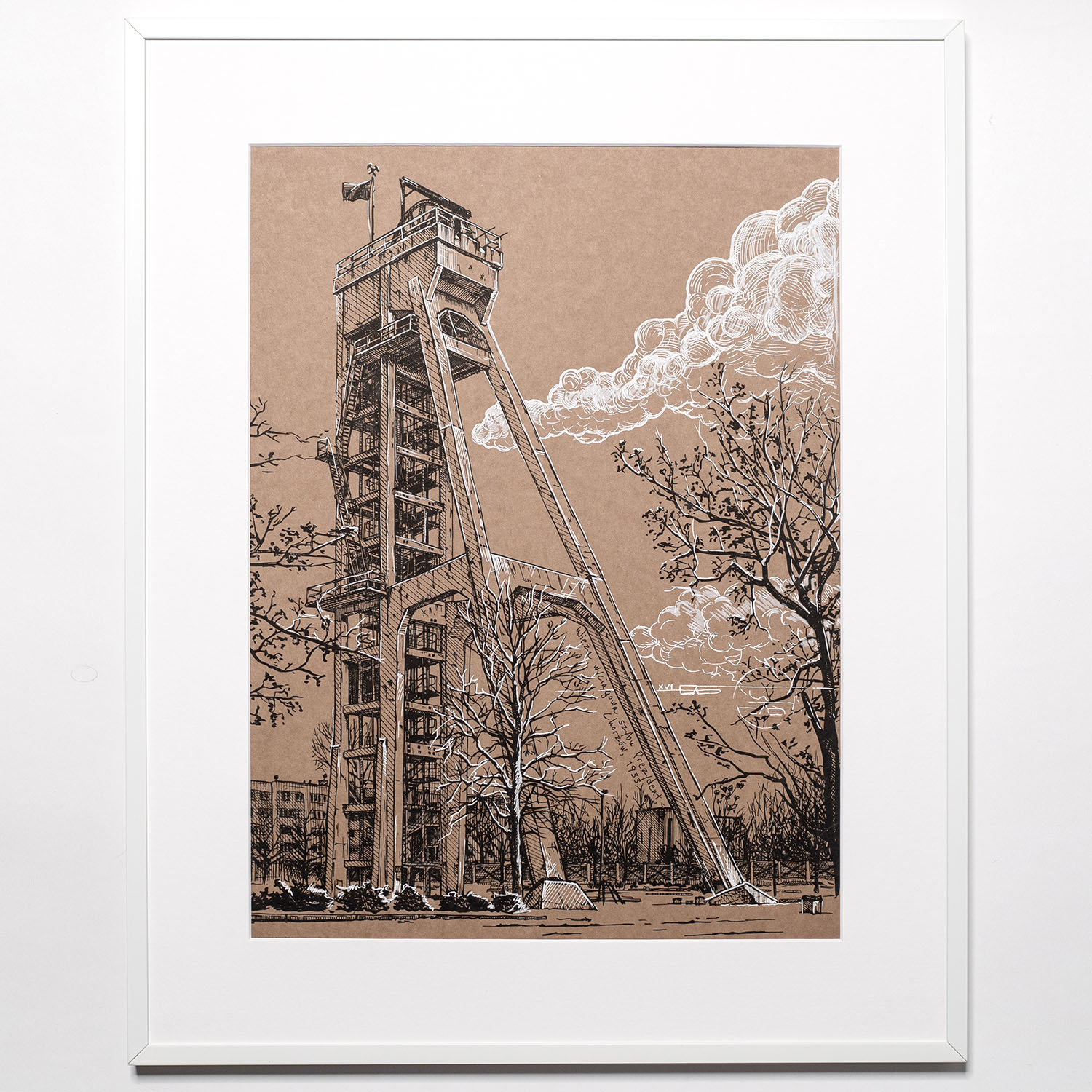 Grafika z serii „Niebo nad Śląskiem” przedstawia Szyb Prezydent w Chorzowie – jeden z najbardziej rozpoznawalnych symboli przemysłowego dziedzictwa Śląska. Charakterystyczna stalowa wieża szybu, ukazana na tle ręcznie rysowanych białych chmur, stanowi hołd dla górniczej historii regionu.