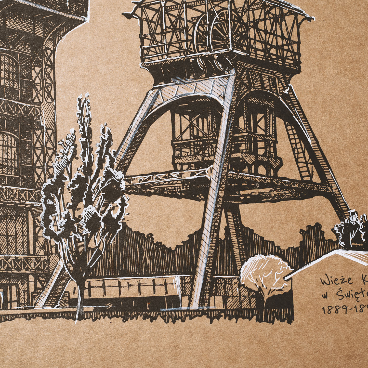 Grafika z serii „Niebo nad Śląskiem” przedstawia majestatyczne wieże Kopalni Węgla Kamiennego Polska w Świętochłowicach – symbol przemysłowej historii i tożsamości Śląska. Charakterystyczne konstrukcje wież zostały ukazane na tle ręcznie rysowanego nieba, ozdobionego delikatnymi białymi chmurami, które dodają pracy unikalnego, artystycznego wyrazu.
