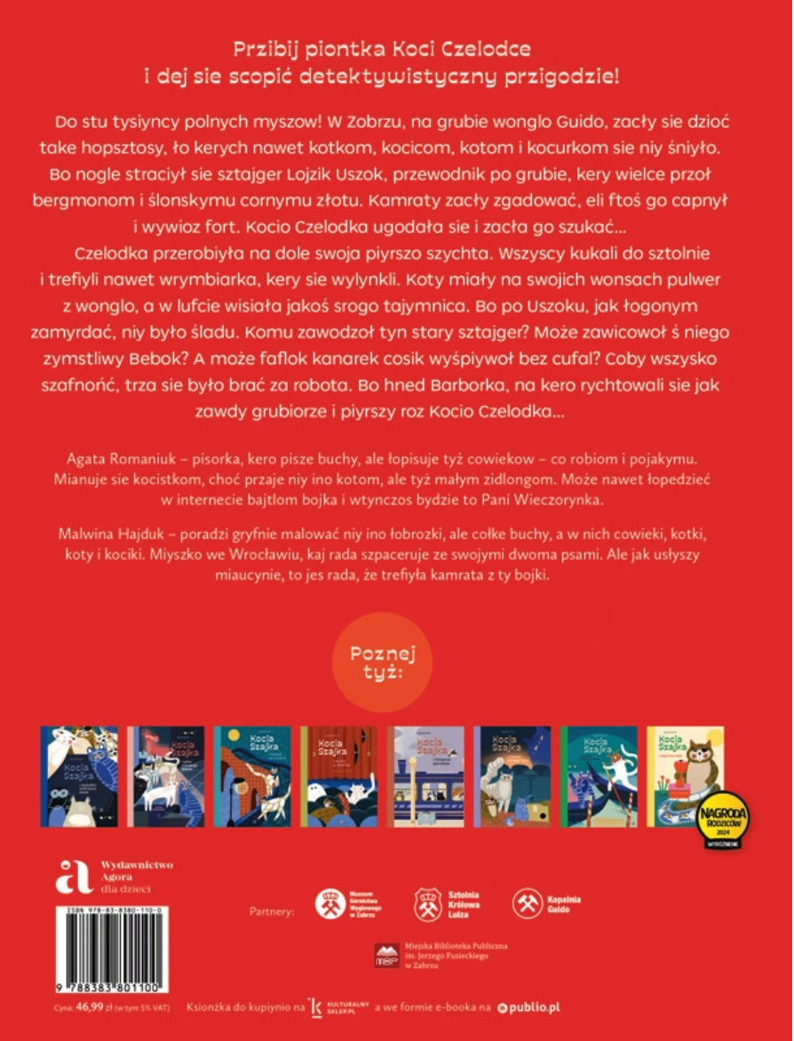 Do stu tysiyncy polnych myszow! W Zobrzu, na grubie wonglo Guido, zacły sie dzioć take hopsztosy, ło kerych nawet kotkom, kocicom, kotom i kocurkom sie niy śniyło. Bo nogle straciył sie sztajger Lojzik Uszok, przewodnik po grubie, kery wielce przoł bergmonom i ślonskymu cornymu złotu. Kamraty zacły zgadować, eli ftoś go capnył i wywioz fort. Kocio Czelodka ugodała sie i zacła go szukać…