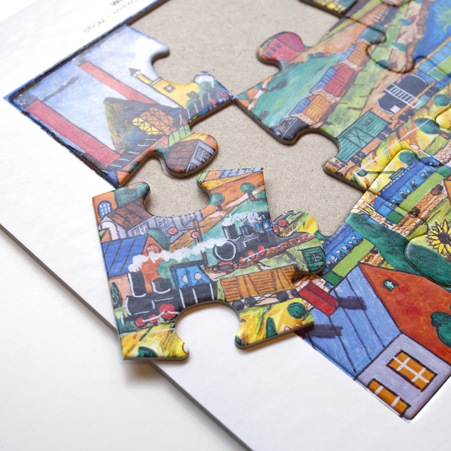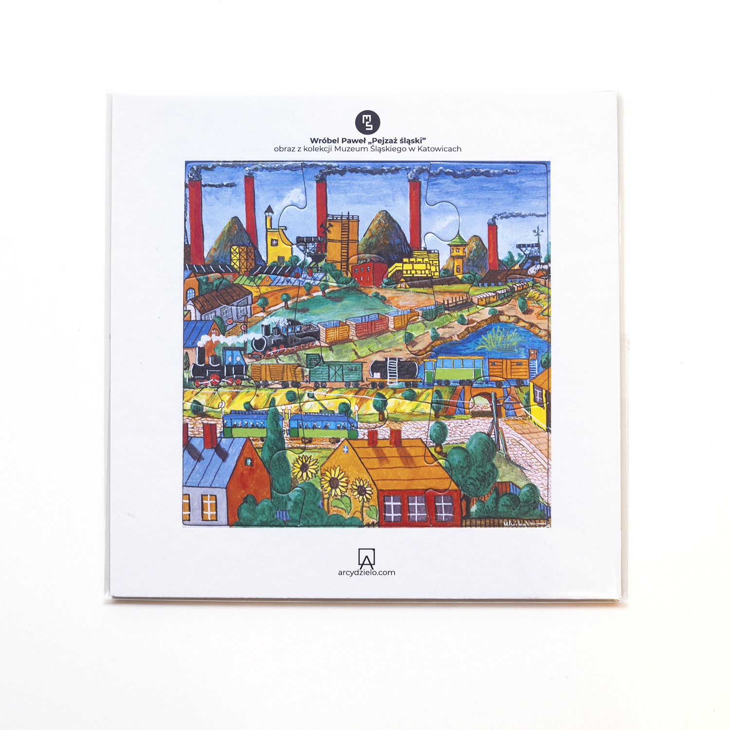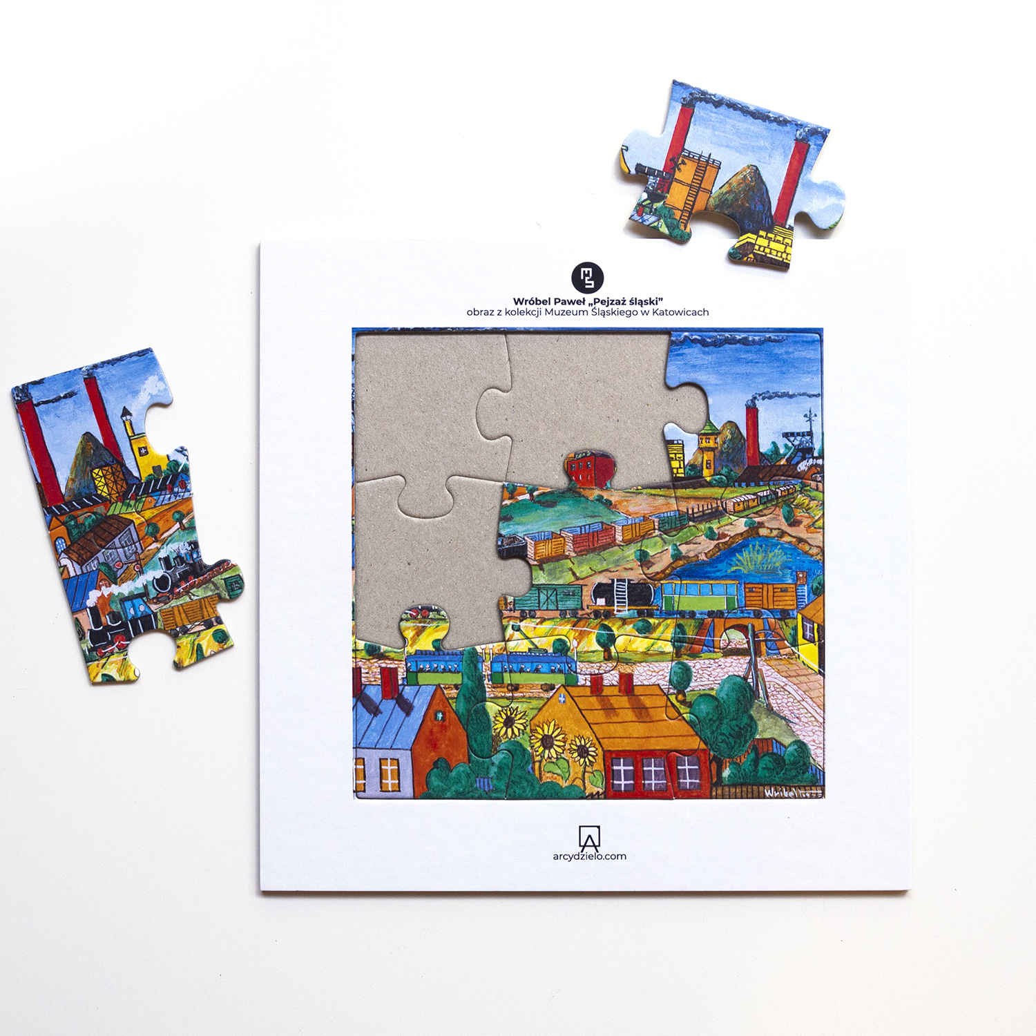 Puzzle dla dzieci z obrazem „Pejzaż Śląski” autorstwa Pawła Wróbla. Obraz z kolekcji Muzeum Śląskiego w Katowicach.